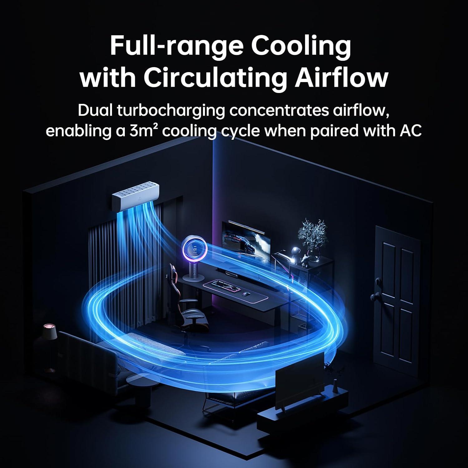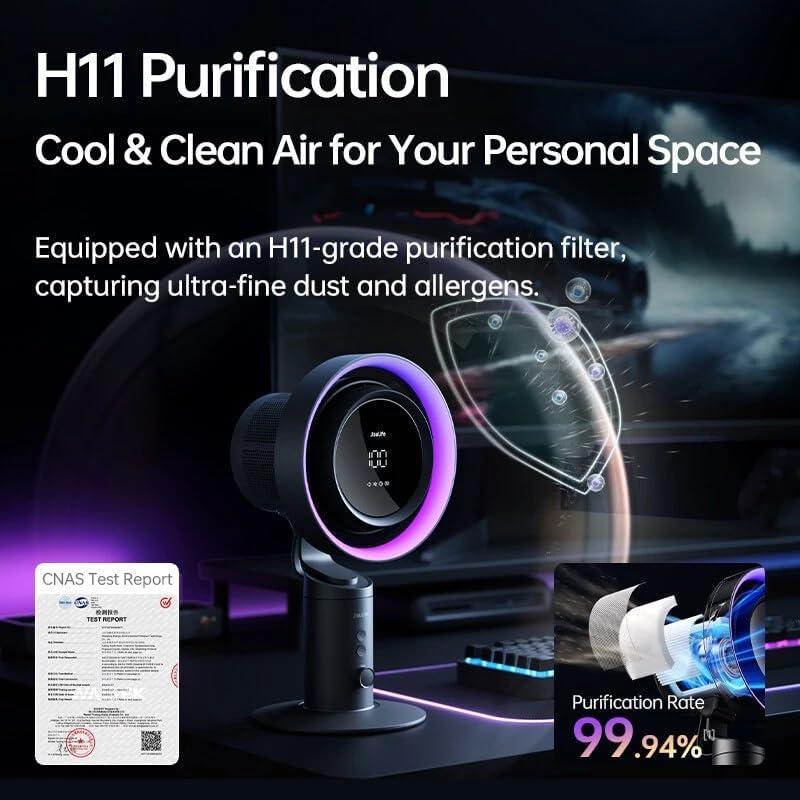 3-in-1 Turbo Desk Fan: Combining a high-speed fan, H11 HEPA air purifier, and customizable RGB mood light, this tabletop fan cools, cleans, and beautifies your desk, office, or bedroom with one compact device